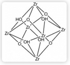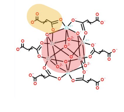 Le nœud inorganique présent dans le MOF-801 (entouré en rouge) est le cluster Zr₆O₄(OH)₄, il contient 6 atomes de Zirconium disposés en géométrie octaédrique et reliés par des ponts oxo et hydroxo. Cela forme ensemble une unité compacte. Les atomes de zirconium sont arrangés selon une géométrie interne régulière. Chaque cluster possède des sites de coordination disposés autour de lui afin d'accueillir les ligands.