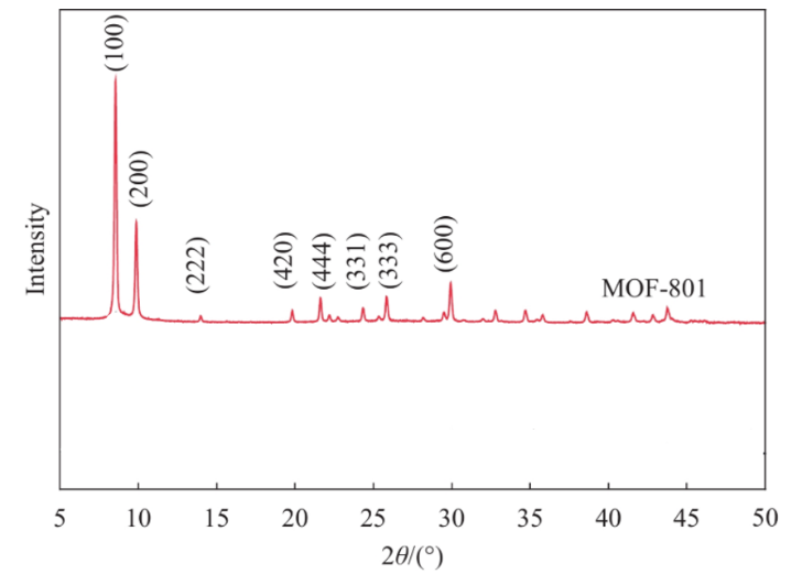 Cette méthode permet de passer de la structure décrite du MOF dans l'espace réel par sa maille aux informations dans l'espace réciproque. Ainsi, chaque point du réseau réciproque correspond à une famille de plans atomiques (désignés hkl) de l'espace direct. La diffraction des rayons X sur poudre (DRX) permet de vérifier la structure interne du MOF-801 et constitue la preuve structurelle de la réussite de sa synthèse.