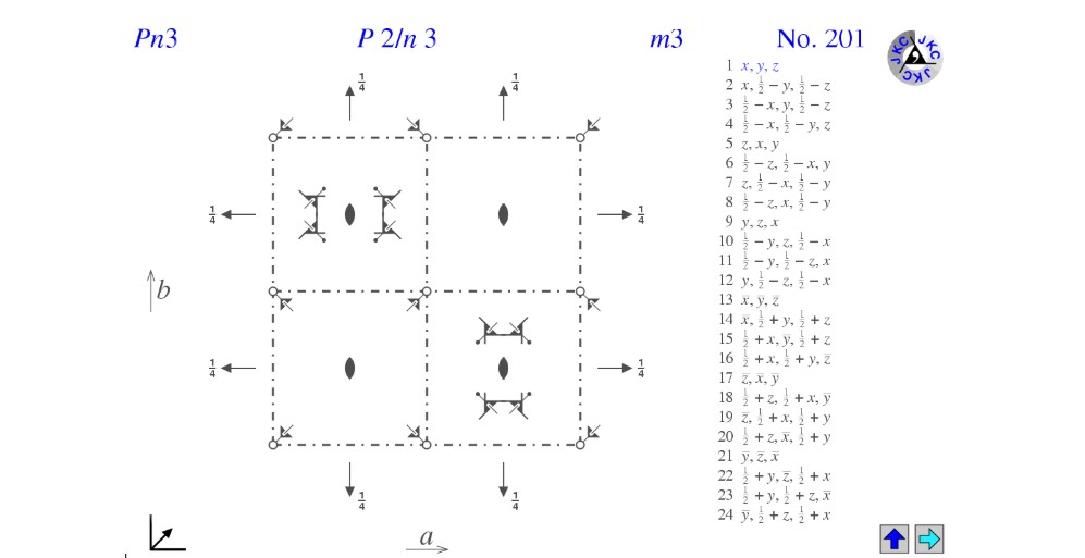 La symétrie idéale du MOF-801 est souvent décrite selon le réseau Fm-3m (cubique à faces centrées). Cependant, en analysant le fichier CIF, on constate qu'il nous indique le groupe spatial Pn-3. Bien que non étudié au cours, cette symétrie est une version primitive du réseau dans laquelle les ligands fumarates réduisent légèrement la symétrie globale. Ce groupe spatial se caractérise par une haute symétrie présentée ci-dessous.